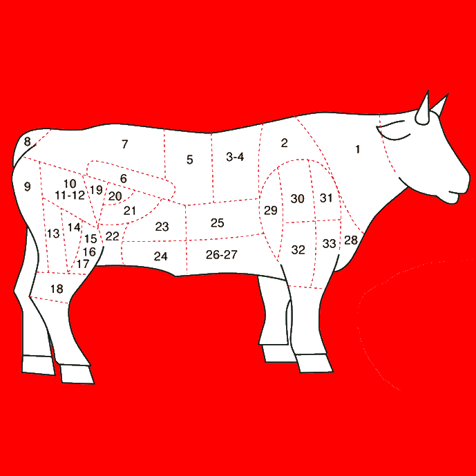 | 27 | Milieu de poitrine | 200 g sans os / 250 g avec os | Braiser | bouillir |